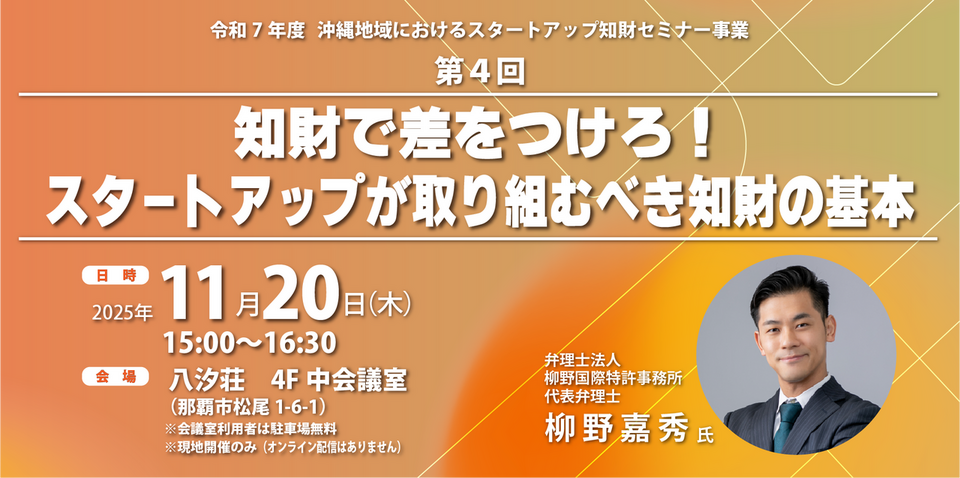 そこで、沖縄県内のスタートアップ、特に研究開発に取り組むディープテックスタートアップを主な対象として、知財活用の浸透と地に足のついた知財戦略の構築を支援することを目的に、全5回にわたる知財セミナーを開催します。