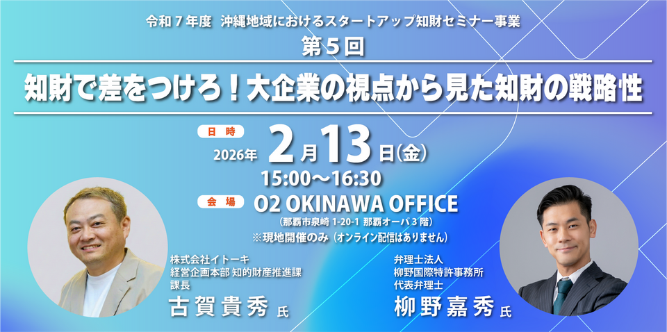 そこで、沖縄県内のスタートアップ、特に研究開発に取り組むディープテックスタートアップを主な対象として、知財活用の浸透と地に足のついた知財戦略の構築を支援することを目的に、全5回にわたる知財セミナーを開催します。