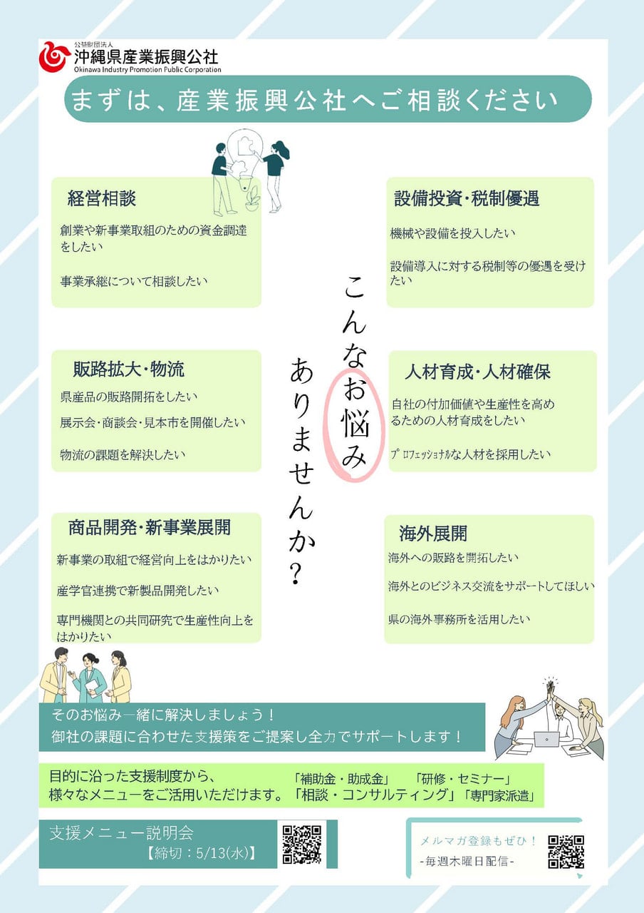 みなさん、お待たせしました!沖縄県産業振興公社の支援メニュー説明会を、中部地区にて開催いたします!様々な支援メニューの案内に加え、公社職員による個別相談会も実施いたします。補助金の案内もありますので、多くの皆様のご参加をお待ちしております。